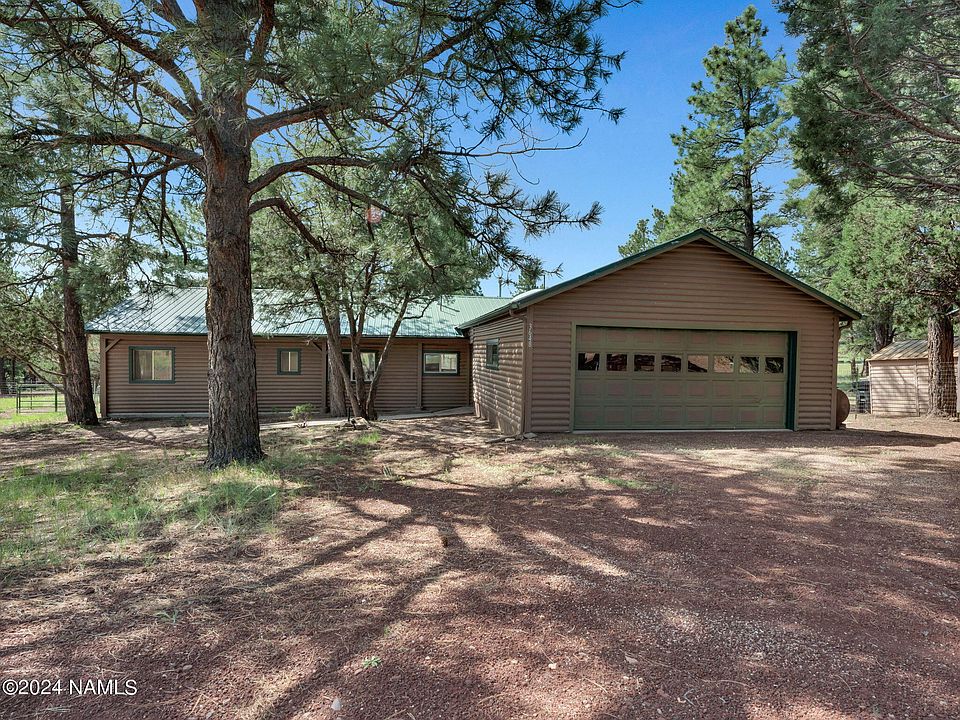 Discover your dream retreat on a 1-acre lot surrounded by majestic pine trees and abundant wildlife. This charming log-sided home features a durable metal roof, a cozy propane fireplace, and a rear porch with Trex decking, perfect for soaking in the tranquil views. The property is partially fenced and includes a 2-car garage and two 12x16 sheds for ample storage. A 1600-gallon cistern tank ensures a reliable water supply. Whether you're watching deer graze or simply unwinding in nature, this serene haven combines rustic charm with modern conveniences. Don't miss out!
