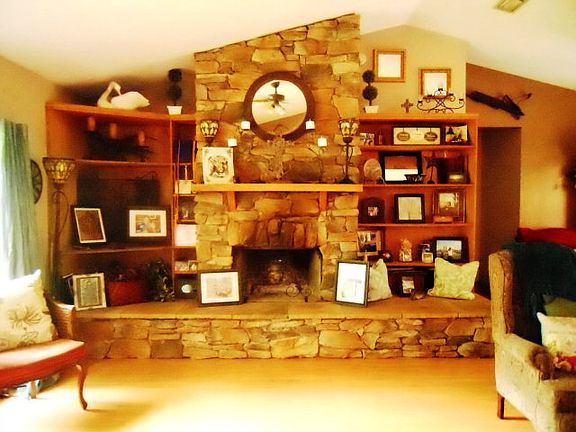 COUNTRY CHARMER! PAVED ROAD! 2001 CB home on 5 acres w/wooded privacy as the home is surrounded by oaks & other hardwoods. 3 bd/2 ba home has a bonus room that could be a 4th bdrm, den or family room. Beautiful stone fireplace has entertainment ctr & shelves on either side. Floors are easy to maintain wood laminate & tile. Large kitchen has plenty of wood cabinets and a breakfast bar for extra seating. Home has a warm, country feel inside and out. Enjoy sitting on the back patio or drive just 3