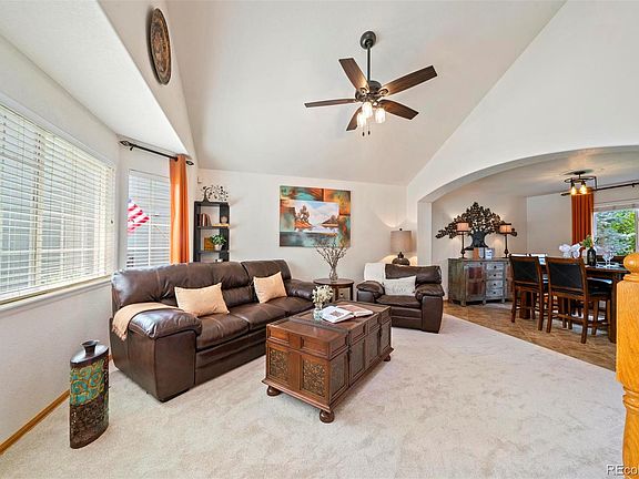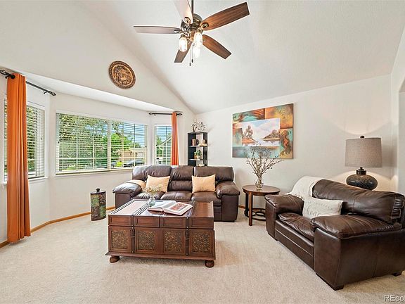 Welcome to an immaculate, much-loved home filled with sunshine, comfortable living spaces, and a fantastic backyard overlooking a greenbelt! You can't beat the amazing neighborhood, with close proximity to amenities and parks, plus easy access to I-25. Inside, brand-new carpet across the main level is highlighted by tall ceilings and large bay windows which fill the rooms with natural light. The formal living room entry is open to the dining room, spacious enough for a large table and buffet for entertaining ease when hosting meals with loved ones. The kitchen is the bright social hub of the home and features new Samsung® stainless steel appliances, wood floors, ample storage and prep space, a eat-in nook with bay window, and walk-out to the backyard for outdoor dining. The kitchen flows into the great room, warmed by a gas fireplace with entertainment nook and overlooks the backyard. Upstairs, the master retreat is set under a vaulted ceiling and is accompanied by a 5-piece bathroom with jetted soaking tub and a walk-in closet. Three more bedrooms and a full bathroom round out the upper level. One bedroom features a French door entry and is currently used as an office. Outdoors, the backyard will become your favorite living area! Take advantage of this amazing space highlighted by a spacious brick patio, lush green grass, and a playset perfectly shaded by mature trees. Your backyard playground is extended with the adjacent greenbelt just pass the fence. Enjoy the additional bonus of low taxes and HOA dues. There's simply so much to love about this amazing home!