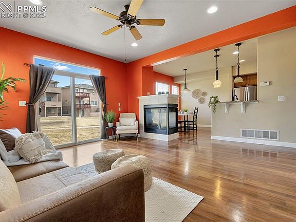This townhome is not only beautiful and cozy, but also conveniently located in Colorado Springs. Here are some additional points about the property that might interest you. The wood flooring throughout the main level adds warmth and elegance to the home. The granite countertops and stainless steel appliances in the kitchen are not only stylish, but also durable and easy to maintain. The gas fireplace between the living and dining rooms is perfect for chilly nights and provides a cozy ambiance. The finished basement with surround sound is ideal for entertaining guests or for movie nights with the family. The air conditioning is a great bonus, especially during hot summer months. Having the laundry room located upstairs near the bedrooms is a practical feature that makes doing laundry a breeze. The fact that the property is situated at the end of the unit means that you'll have more privacy and the open space and walking trail nearby provide a great opportunity for outdoor activities and relaxation. This townhome has a lot to offer and is definitely worth considering if you're in the market for a new home in Colorado Springs.