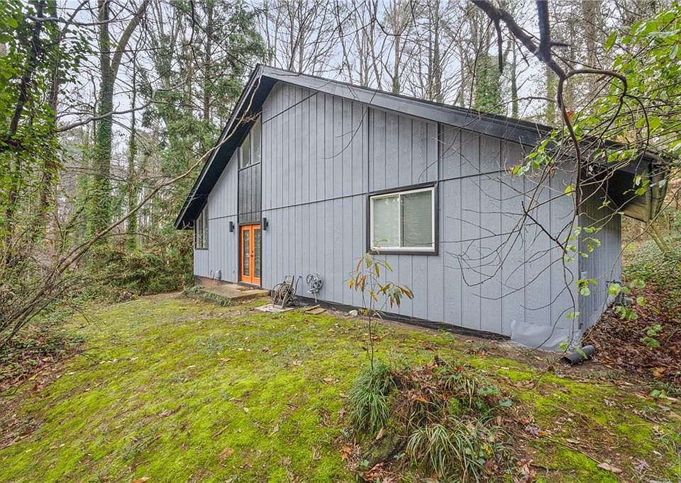 Modern meets the Woods!! Private hilltop retreat close to all you need! If you dream of mountain living but need to stay close to city, this could be your dream! Long private driveway crosses a small creek and leads to parking pad or attached carport. Take in nature at the level area with firepit that overlooks wooded yard. Carport could also be used as a covered patio, or even enclosed in future for a screened patio. Upon entering you keep the sense of nature with you via the thermal pane windows keeping the view of woods. The vauted ceiling gives you space and expanse.Modern interior with black/grey/stainless kitchen, wide spiral staircase, and modern neutral color-scheme. Owners do not use large fireplace, other than as a decorative focal point. Hallway leads to full bath, laundry, and oversize bedroom with walk-in closet that connects to hall bath. Upstairs features private bedroom and lofted bedroom. Lofted bedroom is currently used as an office and is great spillover living space for roommate living, teen suite, etc or call be walled in for private bedroom. Just a few miles from Hartsfield-Jackson for those who enjoy travelling, close to I285/75/85 and Camp Creek Marketplace. Shown by appointment only with 24 hour notice - pets on premises - do not tresspass/enter property without an appointment. There are cameras on the property.