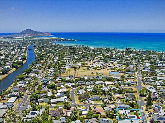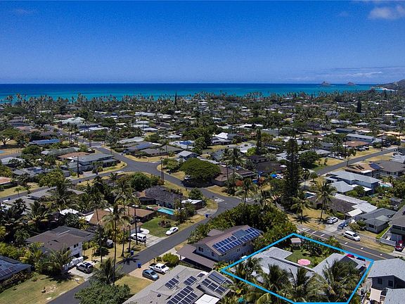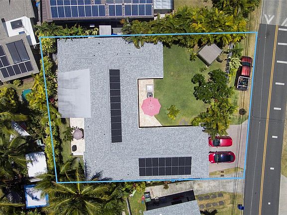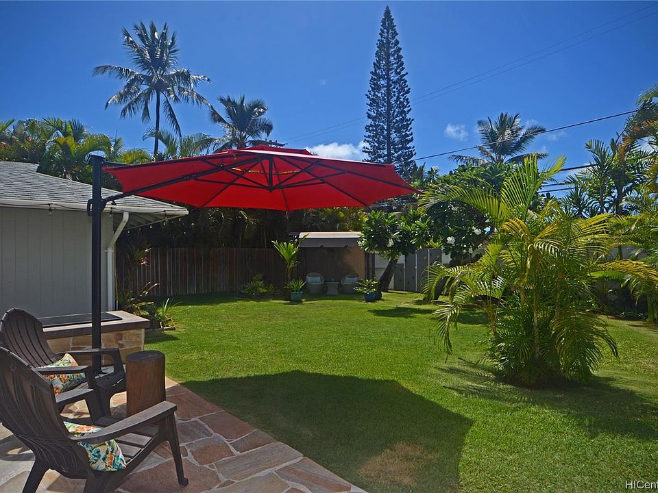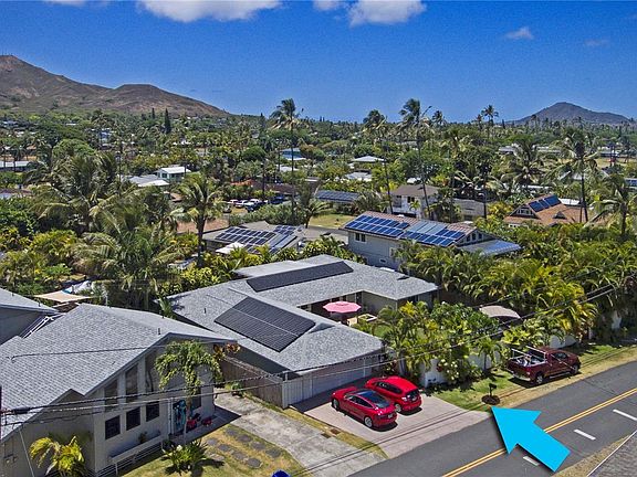 Click on video tours for great views! Private, tropical oasis of Kailua when you live in this beautiful 5/3, single level home. Spacious, open floor plan has a great room that flows into a renovated kitchen, two stone lanais with shell inlays, and giant yard with gazebo. Newer appliances, upgraded windows, plantation shutters, newer 27 panel owned photovoltaic system, engineered wood floors, expansive front yard with firepit. Separate, tutu suite has private entrance, living room, wetbar, bedroom, bath, privacy, laundry, & optional common door to main home. Beach walk to Kailua Bay is 1/2 mile away. Openness, sense of security, privacy, quiet, kid/pet friendly and well-priced! This is a tranquil spot that beckons one to stay. Square footage differs from tax office.