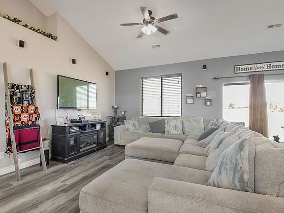 This 4 bed 2 bath home, offers so much space inside and out. The master bedroom is on the opposite end of the home, a nice sized living and dining room area right by the kitchen making it perfect for entertaining! There is wiring in the house for inside and outside speakers (Current speakers seller will be taking). The oversized garage has great amount of space for all your toys AND will fit your vehicles. Back acreage has a big fence perfect for animals, house is stucco making it easy to maintain, front porch area has lighting and is covered perfect to enjoy those evenings outside! Flooring was just replaced in living room.