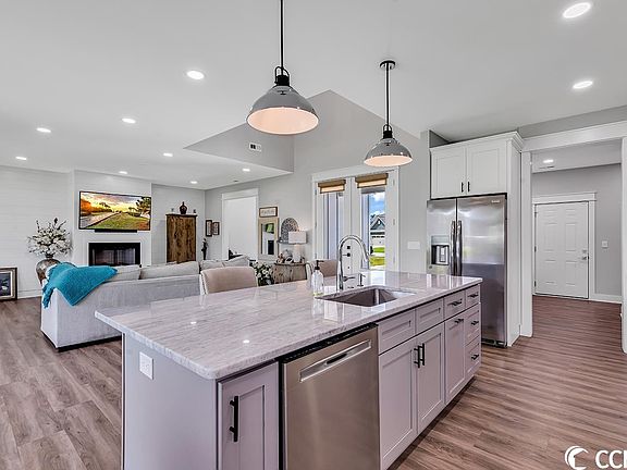 Welcome to this gorgeous custom, year-old home with 4 beds/4.5 baths, a study, and picturesque pond views. As soon as you walk through the grand double doors you will notice the statement fireplace that warms the family room, oversized windows, and glass sliders that overlook the backyard. The luxury vinyl plank flooring flows throughout. The gourmet kitchen with a butler pantry, has an extra-large center island, vast granite countertops, tiled backsplash, and stainless steel appliances. All 4 bedrooms are luxury suites with custom walk-in closets and private bathrooms with tile floors, tile showers, and high-quality fixtures. The owner's suite is on the main floor and has a view of the pond, trayed ceiling, two custom walk-in closets, and an ensuite with an expansive tiled shower that includes double shower heads and a rainfall, and double vanity. Upstairs, there is one bedroom with a bathroom that could also be used as a bonus room. Step outside to the outdoor living area, which has plenty of room to entertain, and a yard that is large enough for a pool. You do not want to miss this opportunity! The beach, shops, and restaurants are all just a few minutes away!