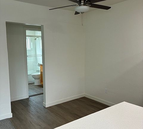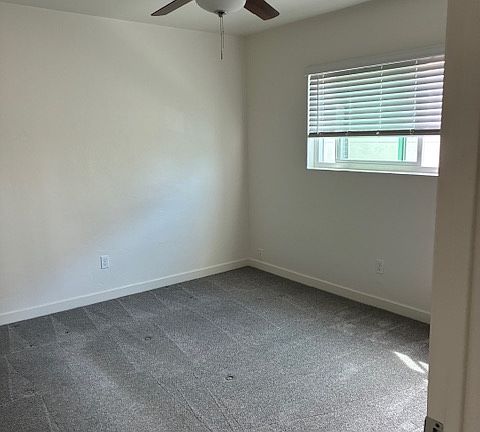 * Bedroom has large window, mirrored closet doors, ceiling fan and fauxwood blinds.