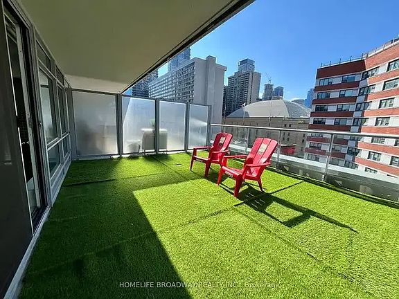Premium Studio Unit. Live/Work In Downtown. Min. To TMU & U Of T, Loblaws, College Park, TTC, Starbucks & More. This Bachelor Apt Has A Total Living Space Of 600 S.F. (323 S.F. In Suit + 277 S.F. In Terrace That Attached To The Apt) With 8 ft Ceiling. It's Unbelievable.Turf, A Twin Bed Frame And New Patio Furniture (Sectional And 2 Red Chairs) Included In The Rent.