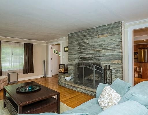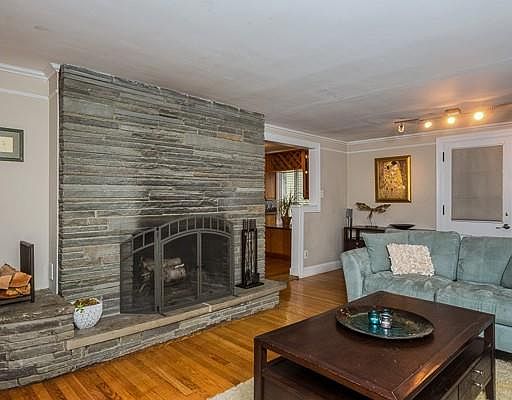 Condex Cape on large level lot with private yard. Amazing cherry kitchen w/granite counters, stainless steel appliances and breakfast bar which leads to large open dining area. Great cherry built in bar area leading to spacious living room with stone fireplace. Hardwood through out. 2 amazing stone fireplaces, Newer oil heat system,1 and 3/4 baths, Full shed rear facing dormer. The finished basement has a large playroom with fireplace and a separate area for an office or exercise room. 3 season porch with new roof and windows. No condo fee