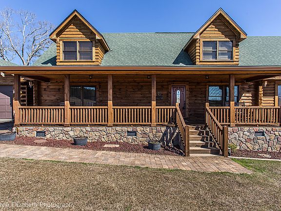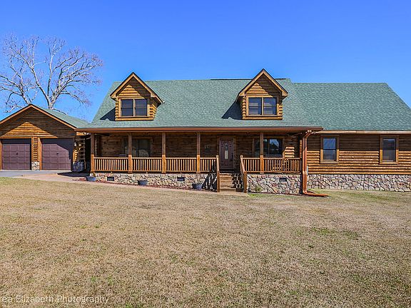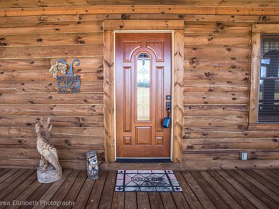 Paradise awaits! Custom built log home with tongue and groove ceilings throughout. Family room features ceilings with stacked stone fireplace. Splendid master suite boasts his/her closets and leads to separate sitting room and office. Second master on main floor. Additional living area upstairs with loft sitting area, 2 bedrooms/ bath. Entertain or work out in the basement area with separate fire proof room. Covered back porch overlooks expansive land with 6 acre pond stocked with bass, brim, and catfish. So much more!!