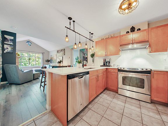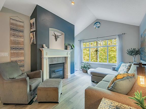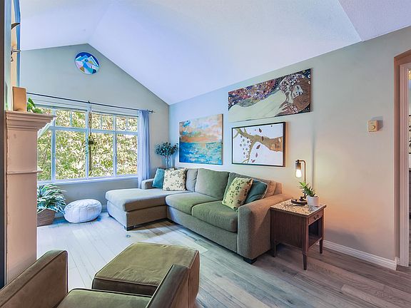 Welcome to Vista East in LoLo - 2 bdrm/2 bath PENTHOUSE w/ Vaulted ceilings & Views onto the Park! Lovely updates throughout this open concept & efficient layout home. Enter into the spacious foyer, and be impressed by the open Kitchen w/generous cabinetry space, new counter tops, sink/faucet & lighting. More storage included w/ built-in pantry & barn door, continue on new hardwood floors which flow to the dining & airy living room w/ vault & gas fireplace PLUS outdoor space (BBQs allowed) on a quiet tree lined street. Both bedrooms have ensuites - ideal for sharing your home w/guests or growing family or work from home office. Laundry insuite, secured parking, locker, and bike room incl. Great well-managed strata pet/rental freindly, just steps to breweries, trails, parks & the Quay.