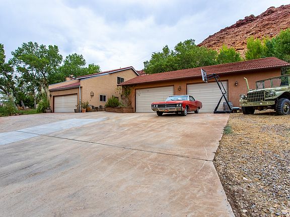 PRIVATE DOWNTOWN! This spacious property sits on 1.60 acres of privacy in Old Town Moab. Tucked into red rock, expanding across the street for additional parking, storage, chicken coops, gardens and potential for an accessory dwelling. You can't wait to store all your toys in the four-car shop, with work benches and concrete driveway. This home has three levels under the mature cottonwood trees- the main level offers a formal foyer, living room, office space, family room, dining room, gorgeous kitchen, laundry, half bath and access to the attached 2 car garage. Upstairs you will find the main bedroom suite, with soaking tub, separate shower and walk-in closet. An open loft for your home gym, TV room or play area, with 2 additional bedroom and a full bath with bonus vanity. The basement holds a full apartment with complete kitchen, living suite, dining area, family room, bedroom and two bathrooms, with independent access. Create your own hiking trails behind the home up into Swiss Cheese Ridge from your backyard on your own private acreage with elevated Moab views. Walk to town, ride to Slickrock, park your Jeep collection- this home has adventure, convenience, space and a rare private location.
