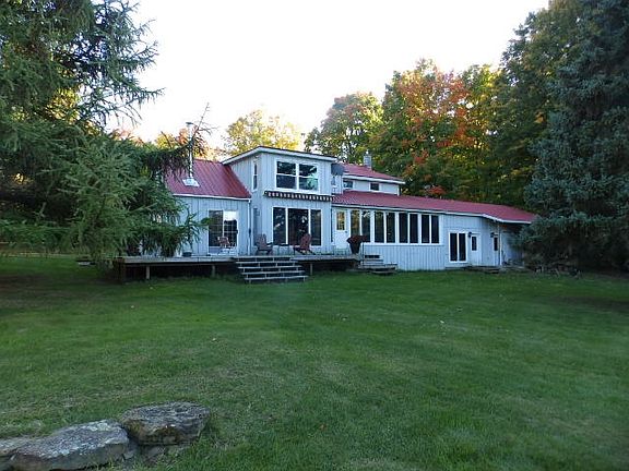 Well maintained circa 1860`s completely renovated farmhouse situated on 30.7 picturesque acres with a large two story barn, split rail fencing, rock walls, trails and a stream running through the Northwest corner of the property. The main floor is comprised of fully equipped oak kitchen with a Lope wood burning stove that steps up in the spacious dining room, living room with built-in cherry bookcases and a Quadrafire woodstove, library/study, laundry room and a bathroom. The sliding door in the dining room open to the deck with a Sunsetter retractable awning overlooking the beautifully landscaped yard. Upstairs features a master bedroom with sitting area, two nice sized bedrooms and a full bath. The breezeway (12 X 14) attaches the oversized two car garage with overhead storage to the home. Updates include newer windows, new furnace, new drilled well (72' deep) and many others too numerous to mention. SLIC TV, internet and phone service is available. This is country living at its best!!