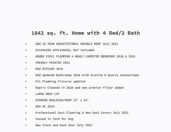 Brand New Roof, Open Concept Living/Kitchen/Sunroom/Dining, Converted Garage to a 4th bedroom, large Storage building/Shop, Extra large wooded lot, Kitchen, bathrooms & AC updated in 2016, Fenced in Yard for Dog, New carpet, fresh paint,