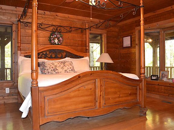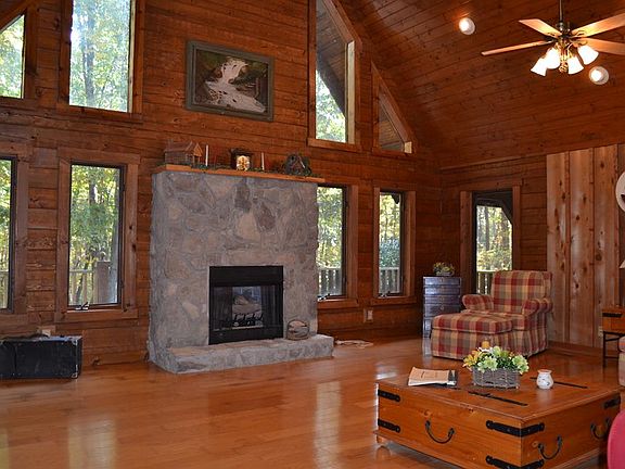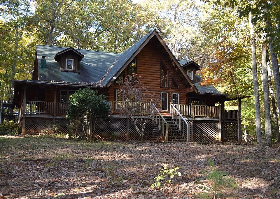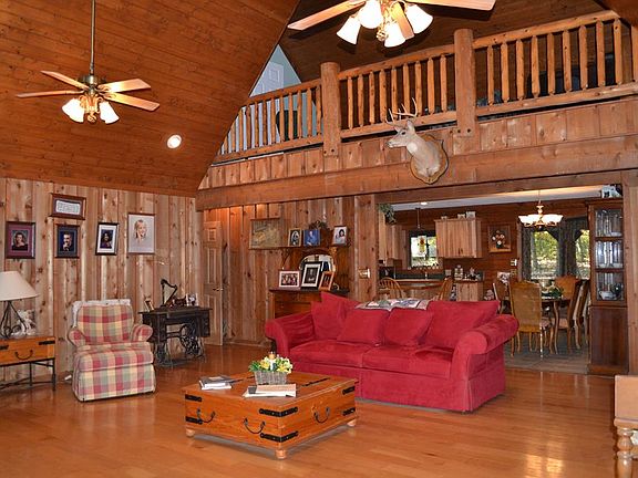 Log home on 12 acres, secluded setting, pond access & wrap around porch. Living room has vaulted ceiling & fireplace. Master suite on main level has large bath w/ tub & step in shower. Kitchen has hickory cabinets & large center island for prep area. Upper level has 2 bedrooms & bath with den area. Unfinished basement with woodstove & half bath. 24 x 24 garage/workshop.