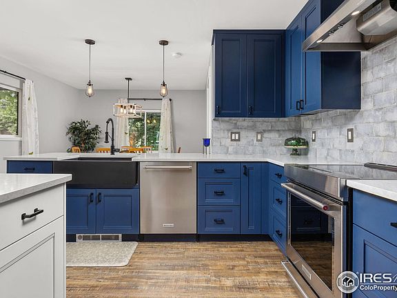Welcome to this fully remodeled 5-bedroom, 4-bathroom stunner in the popular Fraiser Meadows neighborhood-just across from Horizons K-8 and Admiral Arleigh A. Burke Park. Step inside to soaring vaulted ceilings, exposed wrapped beams, and a bright, open layout designed to impress. The indoor living room features a custom gas fireplace, creating a cozy focal point. A full-span nano door opens the space to a large covered patio-perfect for entertaining or relaxing. The backyard offers beautiful Flatiron views, giving you that iconic Boulder backdrop. The heart of the home is a custom kitchen with a massive island, quartz countertops, two sinks, high-end KitchenAid appliances, drink fridge, stand along ice maker and tons of prep space. Whether it's taco night or holiday hosting, this kitchen delivers. The adjacent dining area includes custom cabinetry and a built-in banquet for easy, stylish gatherings. The primary suite is a peaceful retreat with double sinks, a walk-in shower, and stunning tile work. Two additional bedrooms and an updated full bath complete the upper level. Downstairs, the garden-level basement includes a bedroom, a three-quarter bath, a spacious rec room (ideal as a teen hangout or optional sixth bedroom), and a large laundry room. The fifth bedroom is on the main floor with an attached three-quarter bath-perfect for guests or a home office. All of this sits on a 14,000 SF lot and includes a heated/cooled two-car garage with a separate entrance-ideal for a gym, studio, or workshop. New class 4 hail resistant roof is the cherry on top of this amazing home. Thoughtfully updated throughout, this home blends high-end design, everyday comfort, and a location that truly delivers. LOVE WHERE YOU LIVE!!! OH Sat Oct 27th 11-1pm!
