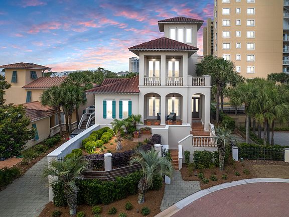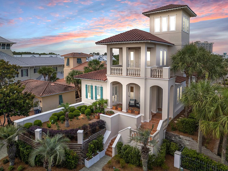 No detail was overlooked in this expanded, meticulously remodeled and structurally enhanced mediterranean style home. Located on the third tier in exclusive gulf-front Caribe, this furnished retreat boasts prime access to the gulf with the allure of a private escape. Step onto the boardwalk from the back porch to access the low-density, snow-white beach deeded for neighborhood residents.Inside the main house, three spacious bedrooms all with en suite baths and a luxurious master suite invite effortless relaxation. A third floor enclosed lookout level offers 360 degree views of the breathtaking horizon through 12 Jeld-Wen Atlantic Coastal windows. The well-equipped kitchen has open shelving, a gas cooktop, and a wine refrigerator. Guests enjoy a rare, separate casita equipped with a full bath and kitchenette. The outdoor shower and boardwalk entrance areas were re-constructed with stone pavers, and new Trex decking was installed on the rear and side deck areas. All interior walls, ceilings, and trim, and all exterior surfaces have been painted, while lush surrounding grounds boast new lighting and irrigation systems. 365 Rue Caribe is being offered fully furnished with a few exceptions.