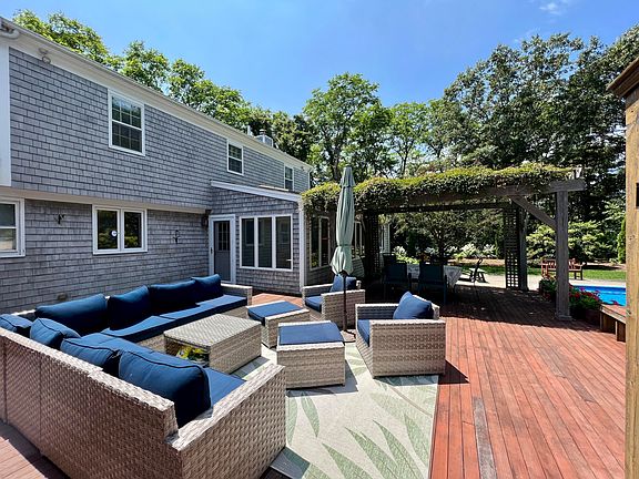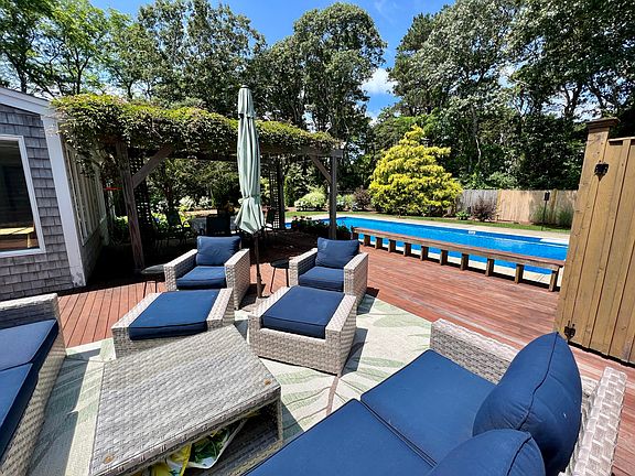 Summer Oasis! This 4 bedroom 2.5 bath home is nicely set on a generous corner lot in a quiet neighborhood in S Eastham. Well maintained, warm and inviting this home is the perfect year round or summer escape with open kitchen, dining and living room. Spend warm summer days under the pergola, by pool surrounded by professionally landscaped gardens. Features include sunroom, 2 car attached garage, circular drive, built in pool, outdoor shower, laundry room, irrigation. Easy access to the bike trail and walking trails, and close to Orleans for shopping and dining.