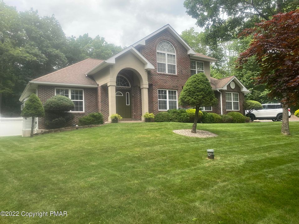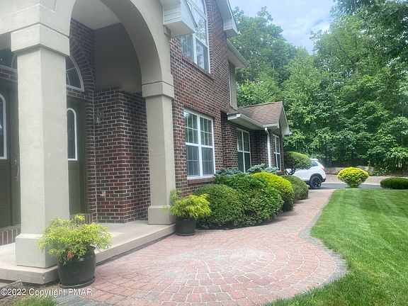 Property is under contract and only accepting back-up offers at this time! Elegant, Beautiful, well maintained custom built colonial with brick and dryvit front on a gorgeous and well manicured lot in The Woodlands! As you walk up the paver walkway to the home, you'll be greeted by a freshly painted door leading into the 2 story marble foyer entrance with a lovely chandelier. 1st flr features include hardwood through most rooms, a living room with a freshly painted vaulted ceiling and a custom gas fireplace with marble surround, a formal dining room ideal for entertaining, a kitchen with attractive granite counters, tile backsplash, tile floors, and a spacious breakfast room with tile floors, slider doors to the exterior, and a 5' closet. A bedroom and a full bathroom complete this level Second floor features include hardwood throughout, a freshly painted primary bedroom suite with a 9.6x7 walk-in closet, a private and a freshly painted primary Bath with tile floors, double sinks, a jetted corner tub, and a walk-in shower. 2 more generous sized bedrooms (1 with cathedral ceilings), and a full guest bathroom complete this level. The lower level is finished to include a family room/recreational room area, an office/den that could also be used as a 5th bedroom, a workout room, and a storage room for belongings or canned goods and supplies. Outside is your own private oasis and retreat, with an inground, heated pool that is surrounded by a custom designed paver patio, a blacktop basketball court, a beautiful gazebo with electric connection, a large shed, custom fenced yard, and lush green grass and stunning landscaping. Other amenities include a 2 car garage, generator hookup, a radon system, newer central air, paved driveway, new well tank, newer septic pump, a 12" poured concrete foundation, a storage attic, and so much more. Located just minutes to Routes 611, 80, and 33 with quick and easy access to St. Luke's Hospital, a variety of restaurants, stores, and endless Pocono recreational activities! Come take a look at this home today!