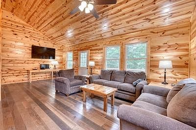 Back on the market with NO fault of the sellers. Buyer financing fell through. Their loss is your gain. Fulfill your dreams of cabin life right here!--Offering quietude, privacy,  and the soothing sounds of Shoal Creek. Nestled in a gated community with few neighbors, this fully FURNISHED rustic cabin—less than five years old—boasts an inviting open-concept living space with beautiful vaulted ceilings, rich hardwood floors throughout, granite countertops and modern appliances. The main level offers two bedrooms and a well-appointed bath, while the terrace level expands your living space with two versatile bonus rooms, a full bath, and a separate storage area with exterior access. Whether you're relaxing on the deck and listening to the creek, enjoying crisp fall evenings by the firepit, or exploring your private 1.89-acre lot, nature is always within reach. This home is the perfect blend of simplicity and charm, making it an ideal getaway or a full-time residence. Discover the mountain lifestyle you've been dreaming of—schedule your showing today!