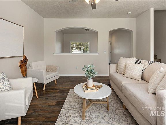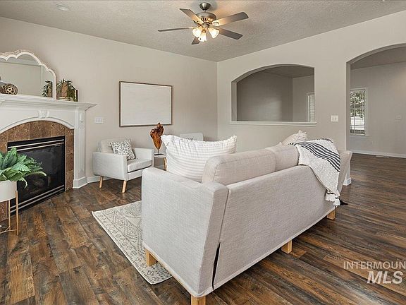 Charm abounds in this central Meridian home: Honeysuckle vines, covered front porch and mature trees welcome you; once inside the rich hard flooring throughout the main level makes the spaces feel large and flow nicely for an ideal entertaining space. Spacious kitchen with sprawling island, window overlooking the backyard and ample cabinet space. The great room has a cozy fireplace with mantle area and large bright windows. Upstairs you'll find the primary suite with ensuite bath: tiled shower, corner soaker tub and dual sinks. Large secondary bedrooms and so much storage throughout. Mature landscaping, a walking path directly to the South (no back neighbors) and an inviting community monument are all part of the charm of Clearbrook Estates - a great neighborhood where pride of ownership abounds! Wonderful schools, great freeway access and parks nearby.