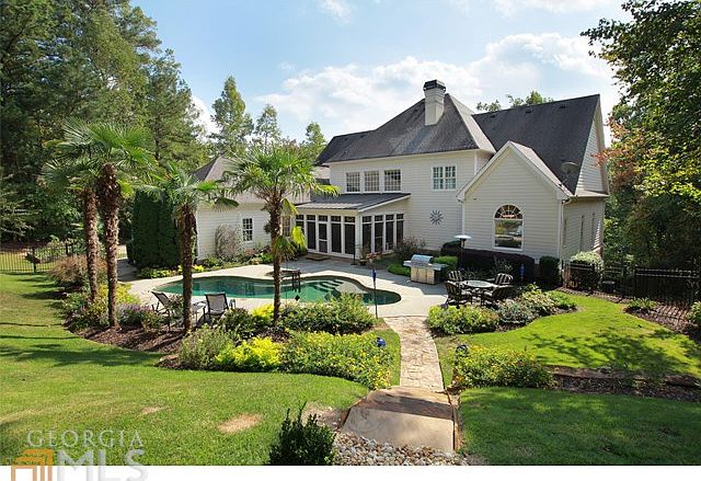 This stunning brick beauty nestles quietly on 1.49+/-, very private acres in beautiful Lakeside at Ansley, gated community with 24 hour security. The open floor plan on the main level consists of exquisite craftsmanship including high ceilings, quality crown molding and millwork throughout. The chef's kitchen is complete with double ovens, granite,stainless steelappliancesand terrific island with built in wine rack, extra storage and a large keeping room. Perfect for entertaining. Spacious master on main features gleaming hardwoods, granite custom tiles and a sitting area. Huge screened porch with vaulted ceiling was added by original builder, Harvey Smith in 2013. Walk out heated pool with Jacuzzi, waterfall and palm trees complete this resort lifestyle. Peaceful and serene, this magnificent home provides everything a family would want, in a luxurious setting.