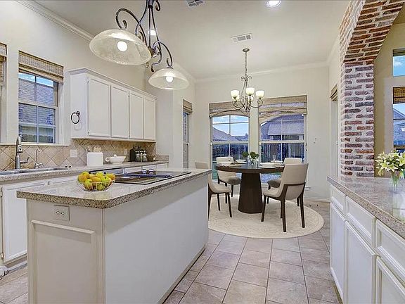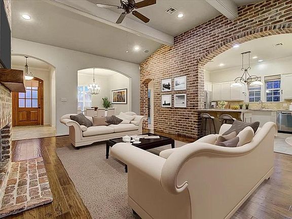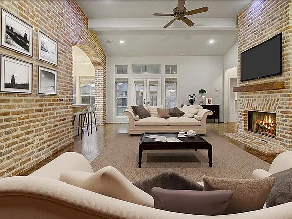 Contemporary-style upgradesOpen floor planBackyard covered patioWood flooringInterior brick decorLarge kitchen islandCustom cabinetry