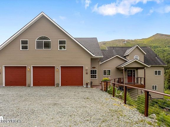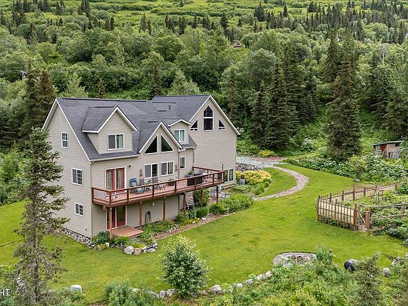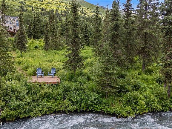 Live the Alaska dream, back country skiing, hiking, mountain biking. Very large house, with incredible views and River frontage. House has lots of extras, gym wit 2 story rock climbing wall, sauna, 1200 square foot 5th bedroom has its own exterior entrance that's legal for home business, or mother in-law studio. In home heated green house. Large lot with chicken coup, enclosed garden,