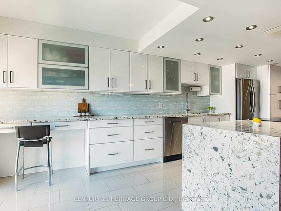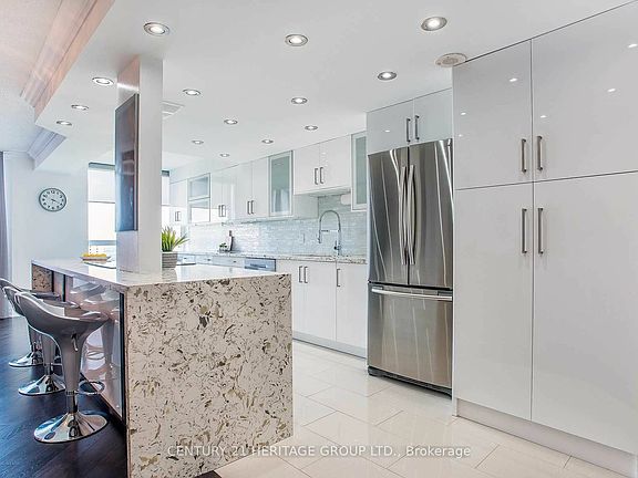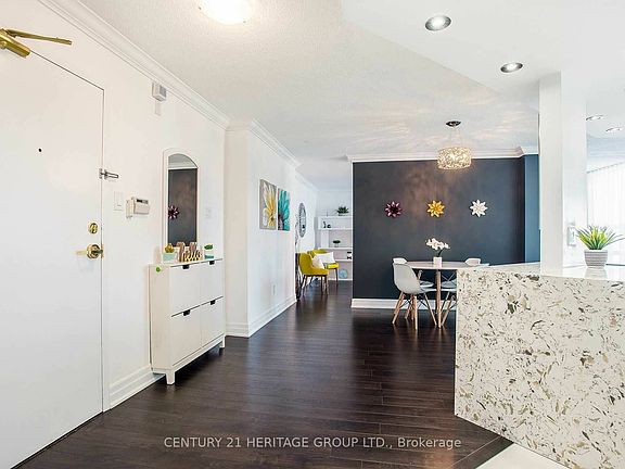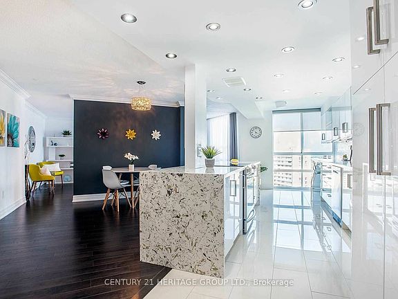 **Premium 2 Parking Spots & 2 Storage Lockers - 1 locker In unit & 1 underground. Large, gorgeous 2 bedroom condo with Stunning Southeast View. Approx 1300 sq ft of elegant living space. This unit features laminate flooring & plenty of storage space. Updated, Dream, eat-in kitchen features 10' island, stainless appliances, quartz counter, porcelaine floors & modern backsplash. Huge living room features crown molding & large windows. Large and functional second bedroom has double closet & plenty of sunlight. Master bedroom features walk-in closet & 3 pc ensuite bath. Enjoy the views of the CN Tower, Toronto's downtown skyline & Lake Ontario. Conveniently located to Transit, Highways, Schools, Square 1 , Restaurants, Arts Centre plus more. **Monthly Maint fee includes cable and highspeed internet** Please note that this building does not allow Pets.
