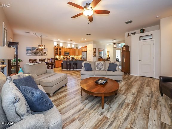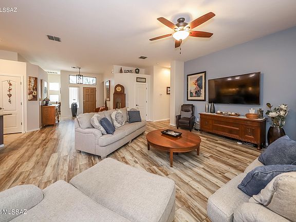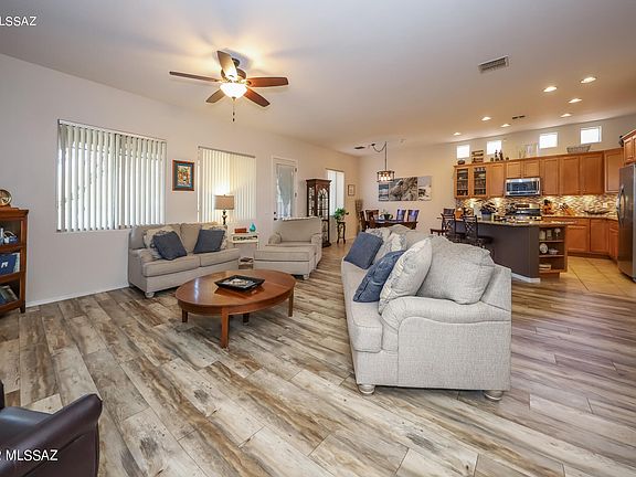 A Lennar built 3Br/2Ba Whitney model single story home backing to natural/riparian area. Kitchen has maple cabinetry and black/stainless appliances, granite counters and an island with breakfast bar that also has pop up electrical outlets. Ceramic tile floors in kitchen and baths, engineered wood in great room area and carpet in the bedrooms. Primary bedroom is a generous size, has 2 walk-in closets and the bath has a garden tub, large walk-in tile shower, & double vanity. This split bedroom plan allows for privacy with the generous sized 2nd & 3rd bedroom being on the other side of the home. Ceiling fans in all the rooms compliment central air. The mountain and sunset views are enjoyed from an extended patio with pavers, sunscreen & canvas drapes. Plus an oversized 2 car garage!