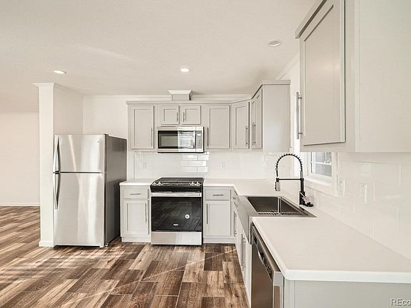 Get ready to Fall in Love! This new 3 bed and 2 bath double wide home in the Ridgeline at River Run 55+ community is stunning!  Beautiful luxury vinyl flooring throughout kitchen, dining, family room, hall and laundry as well as both bathrooms. All new stainless steel appliances in kitchen including refrigerator, stove and dishwasher, Bonus Stainless Farms style Sink! Separate area for dining room table and wide open family room area. Love your large master bedroom with large walk in bathroom with quartz countertop and walk in closet. Love your sliding glass door from Master to private deck access. In home separate laundry room. Ready to make your own! Enjoy your community amenities, including swimming pool, Billiards, Clubhouse and coming soon: a new updated clubhouse, dog park, sauna, card games and internet café. Additionally enjoy making connections with social gatherings, potlucks, holiday celebrations, social clubs and crafts. Location, Location, Location!! This community is situated perfectly with quick access to the front range for hiking or stay local with shopping, dining and healthcare within easy reach.