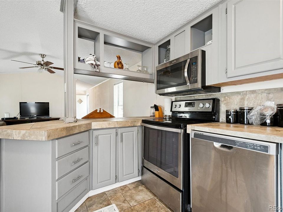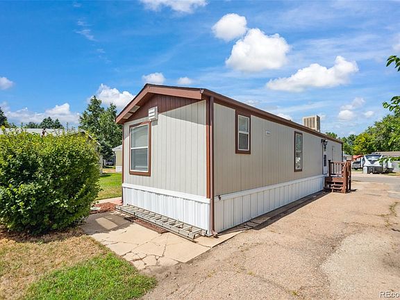 Welcome to this beautiful 2 bed 1 bath home in Ridgeline at River Run! Enter into the cozy living area with plush carpet. All new interior and exterior paint. The kitchen is stunning with grey cabinets, stainless steel appliances and sleek stainless hardware plus a tiled backsplash and hanging display cabinet. There is also a coffee bar in the kitchen and additional cabinets for extra storage. The bathroom has been updated to a white vanity with tiled countertop and an additional hanging cabinet for extra storage and vinyl flooring. Plus, the laundry also has additional cabinets above for more storage and vinyl flooring perfect for easy cleaning. There is also access to the side yard next to the laundry. Fall in love with your outdoor living space with side yard and concrete patio perfect for patio furniture and BBQ. Bonus, the parking area is oversized. There is a shed for extra storage. Enjoy your community amenities, including swimming pool, Billiards, Clubhouse and coming soon: a new updated clubhouse, dog park, sauna, card games and internet café. Additionally enjoy making connections with social gatherings, potlucks, holiday celebrations, social clubs and crafts. This community is located perfectly with quick access to the front range for hiking or stay local with shopping, dining and healthcare within easy reach.