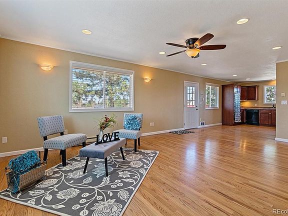 Welcome to this fabulous ranch style home located in Ponderosa Park just 10 minutes from Parker or 5 minutes from Elizabeth. This home offers main floor living plus a finished walk-out basement and a barn for storage or parking that includes a finished fitness room plus a secret hideaway in the loft. The main floor has been remodeled with beautiful hardwood flooring, brand new carpeting, bright white trim/doors and newer kitchen with cherry cabinetry. The family room is spacious and opens to two decks to enjoy the beautiful property and views. The walk-out basement is finished with brand new carpeting, 2 additional bedrooms and full bath along with a family room. There is an enormous bonus space that could be an office, study, work at home space, greenhouse, workshop or craft room with a separate outside entrance. A power transfer panel already installed and ready for your generator making this the perfect place to quarantine when the power goes down. Bring Your Horses, Chickens, Goats - They're All Welcome Here! Pride of ownership abounds with many extra features such as 20 AMP RV Plug and Dog Run. Well water with permit allowing for irrigation and domestic animal watering. Hurry, this spectacular home will not last long!!