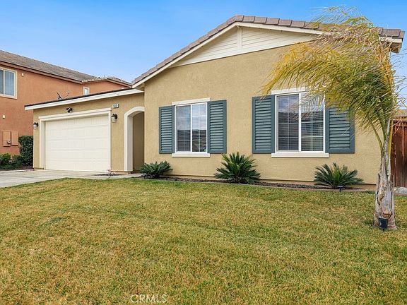 Are you searching for that elusive single-story, pool home in Beaumont? If so, make sure to view this 4 bedroom /2 bathroom single-story in the gated community of Tournament Hills. Built in 2013 on a large 8,276 SF lot, this property has 1611 SF of living space with beautiful mountain views. The interior offers an open and spacious layout with laminate wood flooring, a Nest Thermostat, and natural light galore! The entry door opens to the Great Room with LED recessed lights and ceiling fan. The large kitchen includes granite countertops, white cabinetry, a built-in workstation, stainless steel appliances with 5-burner Whirlpool stove and dishwasher, a deep single basin sink with garbage disposal that was replaced in 2020, a walk-in pantry and a glass door to the backyard. All of the bedrooms are generously sized and offer ceiling fans, and there is a full-size hall bathroom with dual sink vanity. The primary bedroom has a great walk-in closet and the ideal ensuite with soaking tub/shower and dual sinks. Both of the bathrooms feature quartz countertops and newer toilets. A in-home laundry room with included Samsung washer and dryer, and direct garage access to the 2-car garage with epoxy flooring and overhead metal shelving complete the home. Enjoy the private backyard with a hybrid pool (in ground pool with plastic liner and newer pool pump in 2020). Relax on the concrete patio under the Alumawood patio cover with an included Smart TV, 2 fans, 3 sun shades, and enjoy the built-in firepit! There is a gas stub, dusk-to-dawn lights, custom exterior lights, a grass yard and small hillside with boulder retaining wall. Low HOA fees include a catch and release lake, walking trails, gazebo, picnic area and 2 playgrounds. Close to Tukwet Canyon PGA Golf Course, schools, shopping, Cabazon Outlet Mall and just over 30 miles to Palm Springs! Also easy access to the 10 & 60 Fwys.
