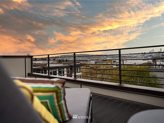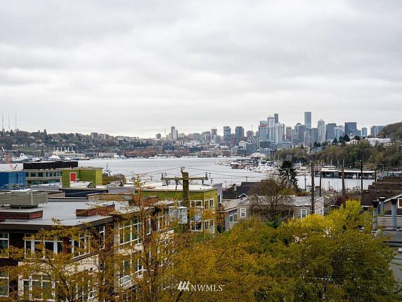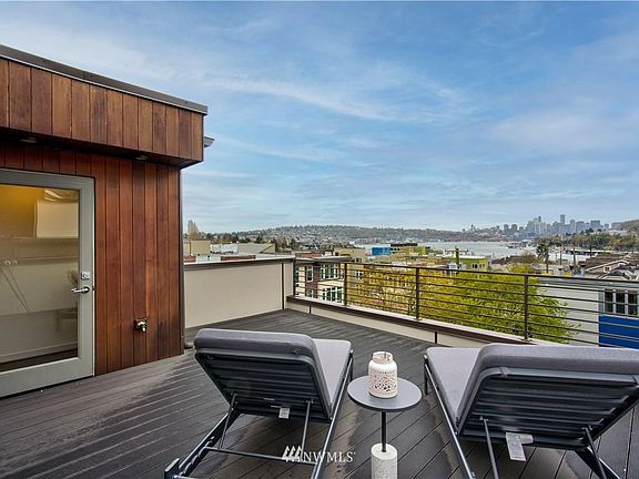 Here's a townhome perfectly conceived for today's work/life balance. Move with ease between stunning views on the plumbed rooftop deck to the comfortable master suite with big city, lake & territorial views through a south facing wall of windows. This home has four bedrooms, presently set up for guest quarters, office & comfy ground floor den. Maybe swap for a workout room, no shortage of choices! The tasteful modern kitchen on the mid level is bright and sunny with more floor to ceiling windows, attractive fireplace, blinds and floors. This home is set back on a quiet street with two car parking. What a location - walkable to both Fremont & Wallingford, a hop & skip to SLU. Paddle board? You'll love life here at the center of the universe!