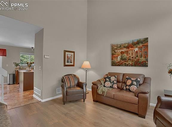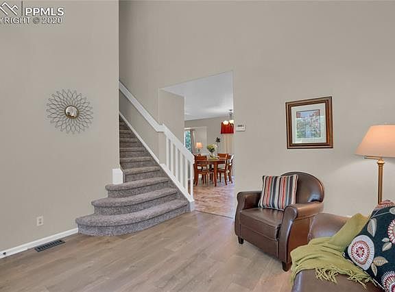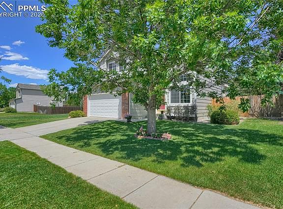 Ideal location with easy access to Powers Blvd yet nestled away in the mature landscaping of the Springs Ranch neighborhood. Bordering open space on the north side, this home has stunning curb appeal. The interior won't disappoint either with new interior paint and new flooring! As you enter into the home, you are immediately greeted with a two-story vaulted entryway leading you into the living room with lots of natural light! The spacious kitchen features an island, Formica counters, dark cabinets, updated lighting, a pantry, an electric range oven, & a stainless steel sink overlooking the backyard! Adjoining the kitchen is the dining area which walks out onto the 15x11 patio! The family room is separated by a pony-wall which offers extra wall space for furniture! The family room is adorned with a gorgeous fireplace accented with a rock surround, & tons of natural light! Located off the family room is an updated 1/2 bathroom & an adjoining laundry room! The upper level features two secondary bedrooms, both with stunning views of Pikes Peak, a linen closet, & an updated full bathroom with 18x18 tile flooring & a newer vanity! The master bedroom is truly a retreat with a spacious walk-in closet, adjoining 5 piece bath adorned with a soaking tub, new tile flooring, double sinks with a cultured stone countertop, & new mirrors! Adjoining the master bedroom is a room that could be used as a library, craft room, or an office! It has built-in shelving and a fireplace, perfect for those cool winter mornings. The outdoor living of this home is absolutely ideal with a backyard that faces east, allowing it to warm up in the mornings but offers shade for evening outdoor dining. The backyard is level, perfect for outdoor games & has a large side yard with a custom walkway! Gorgeous mature trees & landscaping & newer fence make this backyard truly a sanctuary! Tons of features in this house to enjoy including A/C, a humidifier, a crawl space for extra storage!