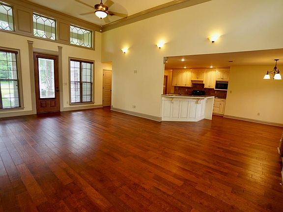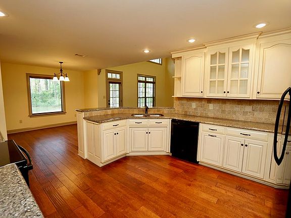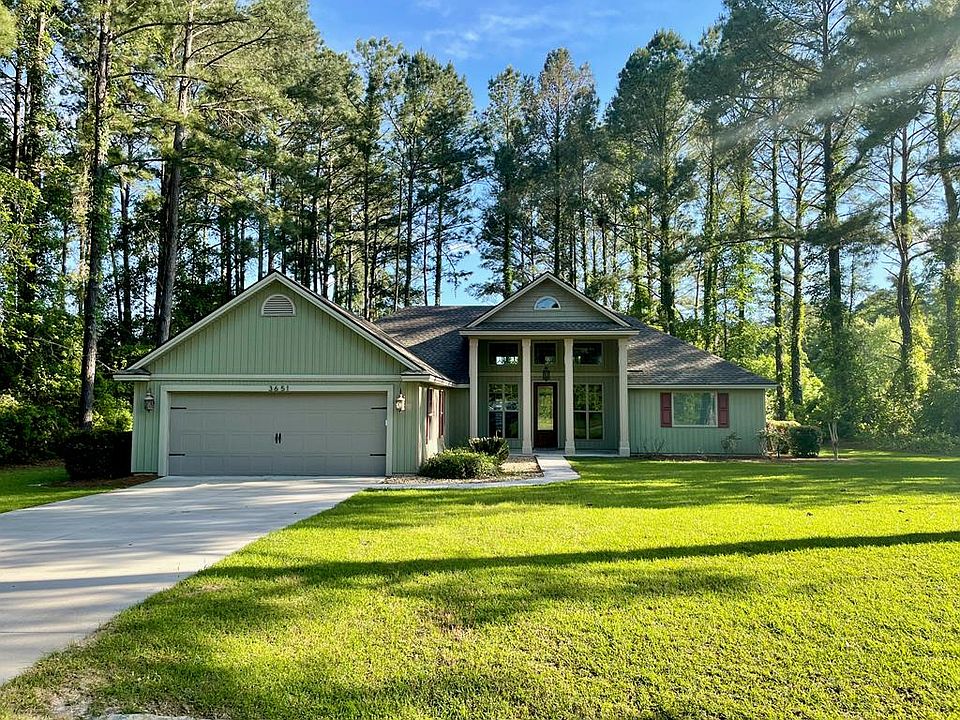 Very nice home with ultra tall ceilings, hand-scraped wood laminate flooring, and plenty of light in the great room. Split floor plan. Master BR is large and has a tray ceiling. Bath has a huge walk-in closet, large soaking tub, separate shower, and two sinks with granite counter tops. Kitchen features granite countertops and a large walk-in pantry! Both of the extra bedrooms and large; one has a walk-in closet. Double garage, covered back porch. Board and batten style vinyl siding. Lot has trees and azaleas in back which form a slight buffer which makes it feel secluded. Great house that won't be here but a day or two. Better hurry!