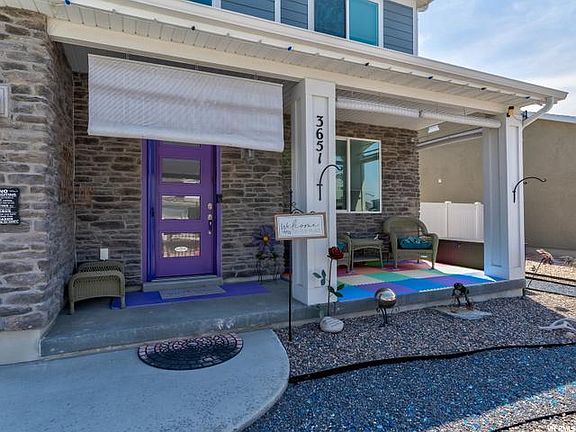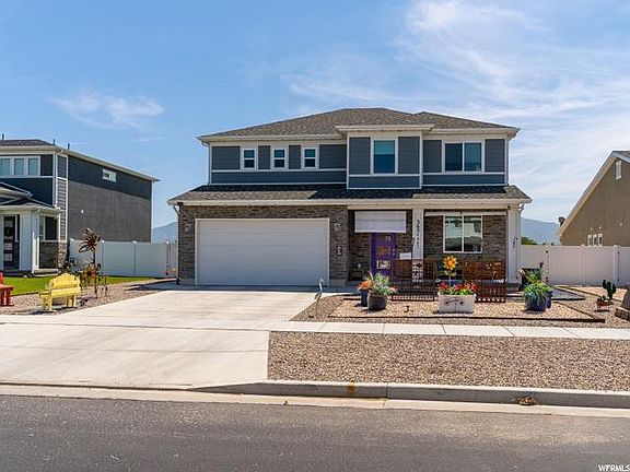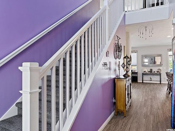 Improved Price! Picture Perfect in Syracuse! This handsome home features water-wise xeriscaping, welcoming front porch with roll-down shades, designer colored front door w/retractable screen & privacy frosted window film / keyless entry. Step inside to the foyer w/ 20' ceilings / custom chandelier / window w/motorized remote shade, easy-maintenance vinyl plank flooring on main lever and wood-look laminate upstairs, formal living room (or dining room), spacious great room, lots of natural light, cordless top-down pleated window shades and custom cornices. White kitchen cabinets with upgraded cabinet lighting above & counter task lighting / subway tile backsplash / black SS appliances (refrigerator included!) / LG upgraded 5-burner stove: gas burners (one burner features ultra heat), and griddle / elect-convection oven with smart feature (cost $4,000) / upgraded GE dishwasher (super quiet - won't even know it's on!) / upgraded granite composite sink / quartz counters on the center island featuring custom pendant lighting. Upgraded carpet on stairs leading to 2nd level featuring generous loft/family room area (wiring for wall-mount tv is hidden behind tv so no unsightly cords!), huge master suite w/upgraded windows that open on W side / custom modern metal barn door / dual sinks / garden tub / upgraded all-glass shower / large walk-in closet w/additional shelving. Additional 2 bedrooms and 1 full bath, and laundry on 2nd level (Kenmore Elite washer and dryer, & clothes hanging rack are included!). Downstairs with sliding glass door w/transom window opens to 16' x 20' covered Trex deck w/solar lights, concrete patio area (or pad for shed), 6' vinyl fence (lifetime warranty) with 2 gates. Garage w/epoxy coated floor and has gas heater and exhaust fan (to cool the space quickly), utility sink, attached workbench, suspended 4'x8' storage racks (included!), added insulation over garage space. Additional features: 9' ceilings, 2x6 walls, upgraded central vac system, exterior holiday lights, elect outlets in the closets and master bath linen closet, whole home Aquasana Rhino salt-free water filtration system (can do 1,000,000 gal) (w/extra unit & filters!), ceiling fans w/lights in all rooms, smart thermostat, upgraded elongated toilets w/self-close lids in master bath and 1/2 bath, 50amp service on N side of garage for RV hook-up, all AC ducts were professionally cleaned 2nd week in June 2021, windows on W side of home had brand new UV protective film installed 1st week in June 2021, interior freshly painted in 2020, no rear neighbors. Woodside Homes Stonehaven IV floor plan. Please use shoe covers that seller has provided. Subj to seller purchasing new home. Call Showing Time to schedule/access code.