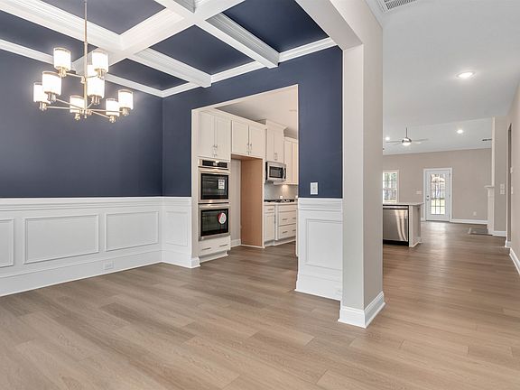 MOVE-IN READY! Stunning new home by Caviness & Cates in Wake Forest in desirable Berklee Estates. Lofty 2 story with wrapped front porch is just the beginning. Open floor plan with second floor catwalk overlooking great room below. First floor owner suite features tray ceiling with his/hers sinks, his/hers walk-in closets and private water closet. Elegant formal dining room w/ coffered ceiling and wainscoting, and gourmet kitchen. Second floor features large loft with separate storage closet. Three additional bedrooms all with walk-in closets. LVP throughout Foyer, DR, Kitchen and Great Room. Covered porch and grill patio set in a beautiful, wooded back setting.