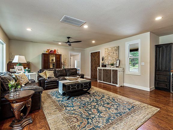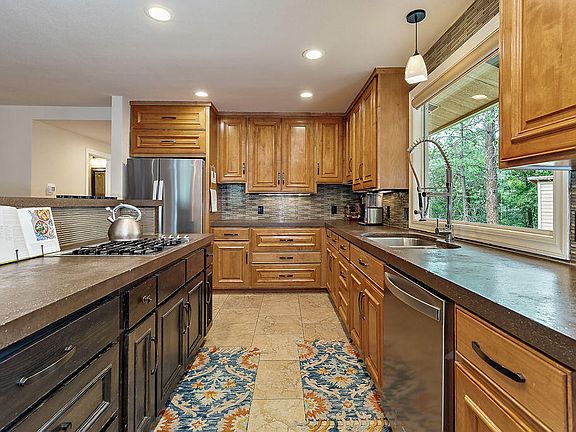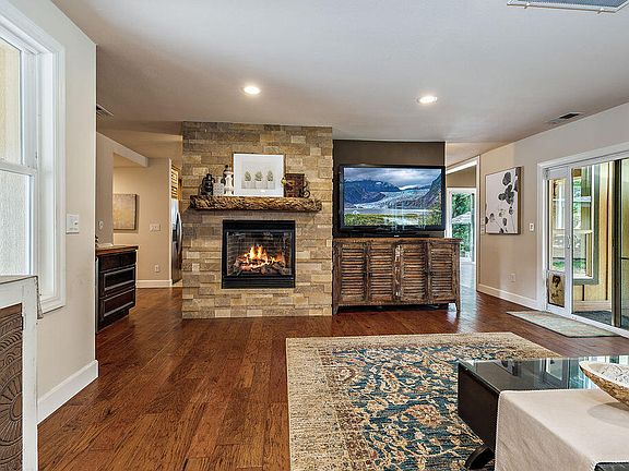 Fully remodeled single level home with every attention to detail throughout. The kitchen is a chef's dream with stunning concrete countertops, tile backsplash, breakfast bar, double ovens, gas cook top and warming drawer. Hardwood flooring throughout the dining area, living and hallways. Vaulted dining room perfectly situated to draw your attention to the treed outdoor setting. You will not want to leave the primary suite with electric fireplace, spa like bath including granite counters, tile shower, soak tub w/ artistic tile surround & large walk-in closet. Two additional bedrooms with plenty of space. Great indoor bonus room perfect for an at home office, gym space or an additional bedroom. Outside is the most magical detached flex space with inviting double barn doors, wood burning fireplace and perfectly situated next to the outdoor fire pit. There is plenty of parking for all your toys plus a large detached shop. The property also boarders Kane Creek.