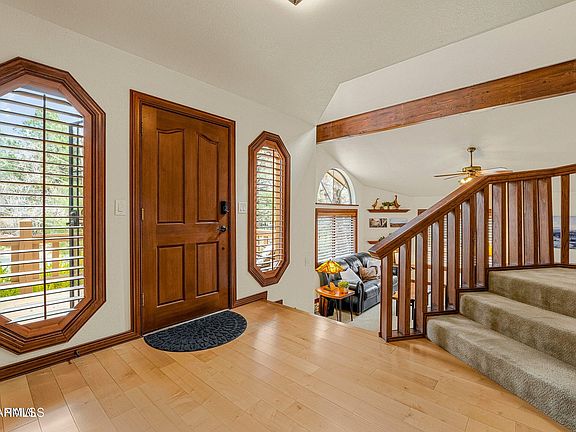 With direct access from your backyard to the Pipeline trail, you won't want to miss out on this well maintained, move in ready quality home located in Skyline Estates. As you enter you will notice the unique architecture that is carried throughout the home. Custom, wood cased windows line the home, adding ample natural light and incredible views. The expansive front deck offers views of Mount Elden or entertain in the private landscaped backyard which backs the trail system and undeveloped space of the neighboring property. In the back you'll be delighted to find the maple, plum and lilac trees. This estate has 5 bedrooms, two living spaces, a wood stove and a gas stove and additional bonus spaces including the loft and nook. Plenty of room to spread out throughout the home. Quality details of this home include vaulted ceilings, granite counter tops, 2 water heaters, 2 air conditioning units, 2 furnaces and SOLAR PANELS that are owned. The luxurious primary suite has a balcony and a dressing area with a vanity in addition to the ensuite bathroom which includes a soaking tub, updated floors and cabinets. This house has abundant storage and a laundry chute! The fully landscaped yard with irrigation system offers year-round living in the cool pines. Centrally located in Flagstaff, you will find yourself close to trails, Bushmaster park, schools, local dining, shopping, and entertainment.