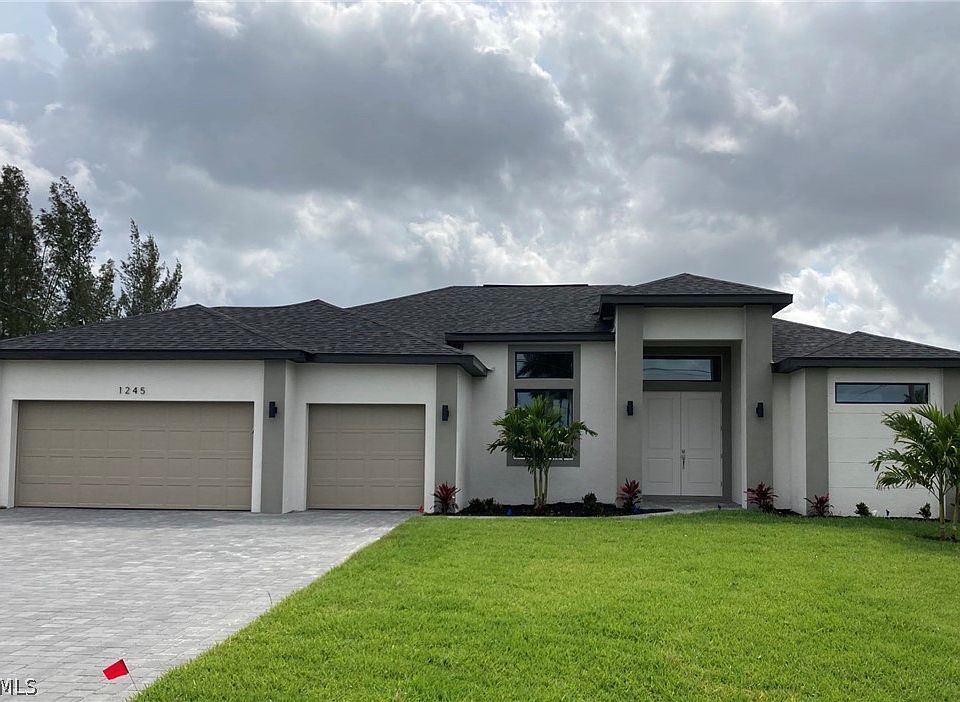Completion May/2022. Best value and exceptional quality. New construction, luxurious contemporary home with plenty of room for a pool. This home is impeccably designed and built with attention to every detail. The open floor plan seamlessly blends indoor & outdoor living. Double entry doors welcome you into the light and bright interior. Expansive living room with high tray ceilings. The kitchen boasts gorgeous 42" solid wood soft close cabinetry with granite counter tops, a broad counter height island along with a stainless steel appliance package.The master suite welcomes you through the 8' doors (found throughout the home), tray ceiling and sliding glass doors into the patio. Large custom shower, garden tub, His & Her Sinks and separate walk in closets. The guest bedrooms are large with tall ceilings and ample closet storage. Beautiful Brick paver driveway and Front Walkway! Lanai with pavers, plumbing and electrical connections for outdoor kitchen. This Home is close to shops, restaurants, boating and THE BEST SW FLORIDA CAN OFFER.