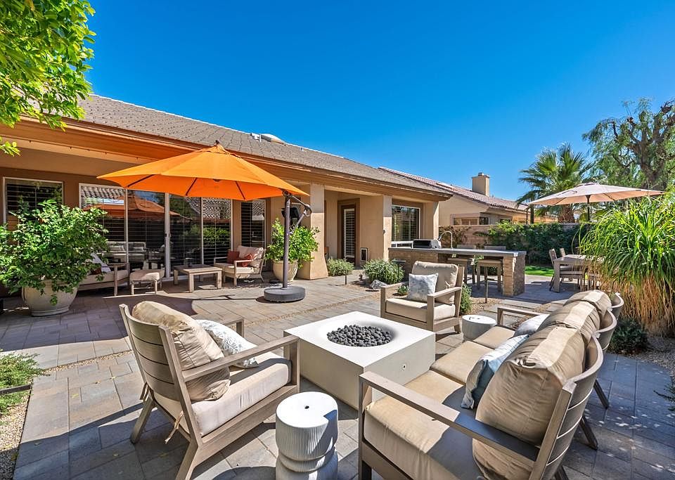 Step into desert living at its best with this stunning Monaco floor plan in highly desirable Sun City Palm Desert. This move-in-ready home offers 3 bedrooms, 3 bathrooms, and approximately 2,515sf of beautifully updated living space. The light-filled open layout features elegant finishes throughout, including remodeled interiors that blend comfort and sophistication. The chef's kitchen opens seamlessly to the family room and casual dining area--perfect for entertaining. The spacious primary suite offers a spa-like bath and ample closet space, while two guest rooms provide flexibility for visitors and/or a home office. Outdoors, enjoy a true resort-style setting with a south-facing backyard designed for relaxation and entertaining. Multiple paver finished seating and dining areas--one elevated with a private shade tree-- all surrounded by lush landscaping and a built-in barbecue for alfresco gatherings. The oversized laundry room provides tons of storage as does the 2-car + golf cart garage. Located within the gates of Sun City Palm Desert, residents enjoy world-class amenities including golf courses, pickleball, tennis, fitness centers, pools, restaurants, and endless social clubs--all with remarkably low HOA dues. Plus, a bonus is the low-cost electricity from Imperial Irrigation District (IID). A beautifully remodeled, move-in ready opportunity in one of the desert's most sought-after active adult communities!