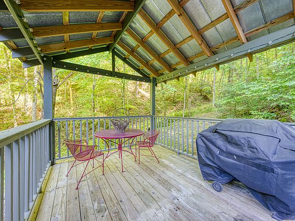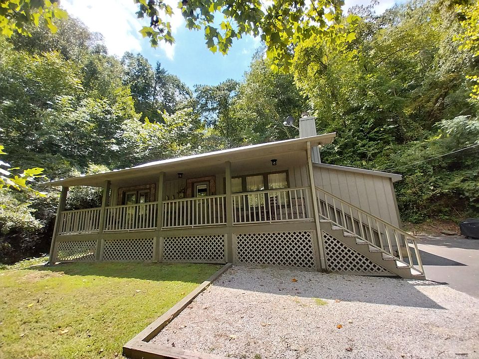 This lovely cottage is filled with charming furnishings and décor. As you step onto the front covered porch you notice the lovely bark accents around the doors and windows and the inviting swing to enjoy the view of the river. Upon entering the living area there's an electric fireplace with large stone surrounding it. It opens to the kitchen & dining area. Nice size kitchen with some ingenious storage areas. Down the hall is the laundry closet, a beautiful full bath and two comfy bedrooms each with French doors to go out to the deck. One has an attached bath with walk-in shower. Out on the back deck is a covered eating area which could easily become a perfect area for a hot tub where you can sit and listen to the creek flowing down the hillside. There is also a storage area with electricity and workshop. You will treasure the moments outside looking at and listening to the Pigeon River. This is a unique & well treasured cottage. Can be a permanent, second home or put it on a short-term rental program. Can't lose either way!