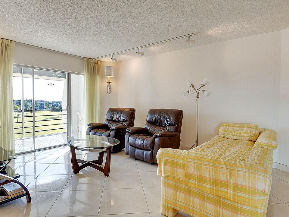 ENJOY BEAUTIFUL GOLF VIEWS FROM THIS PENTHOUSE CONDO WITH DESIRABLE SOUTHERN EXPOSURES FROM THE BALCONY THAT OPENS INTO THE EAT-IN KITCHEN, LIVING ROOM & MASTER BEDROOM. FEATURES INCLUDE LARGE DIAGONALLY LAID TILING IN THE LIVING AREAS, ACCORDION HURRICANE SHUTTERS ON THE BALCONY & A CONVENIENT LOCATION ACROSS FROM THE CLUBHOUSE WITH ITS POOL, TENNIS, PAY-AS-YOU-PLAY GOLF, GYM, MEL'S BISTRO & ENTERTAINMENT, MOVIES, CLASSES, SHOWS, TRIPS & MORE! A QUICK COMMUTE TO PBIA, BEACH, SHOPPING.
