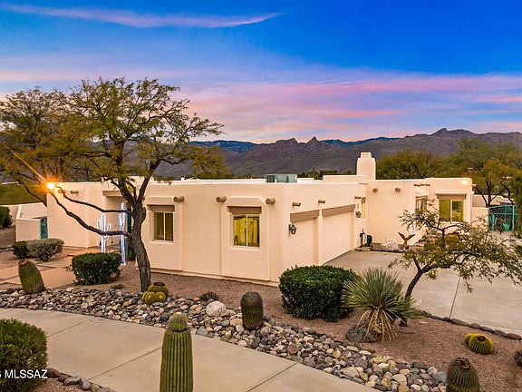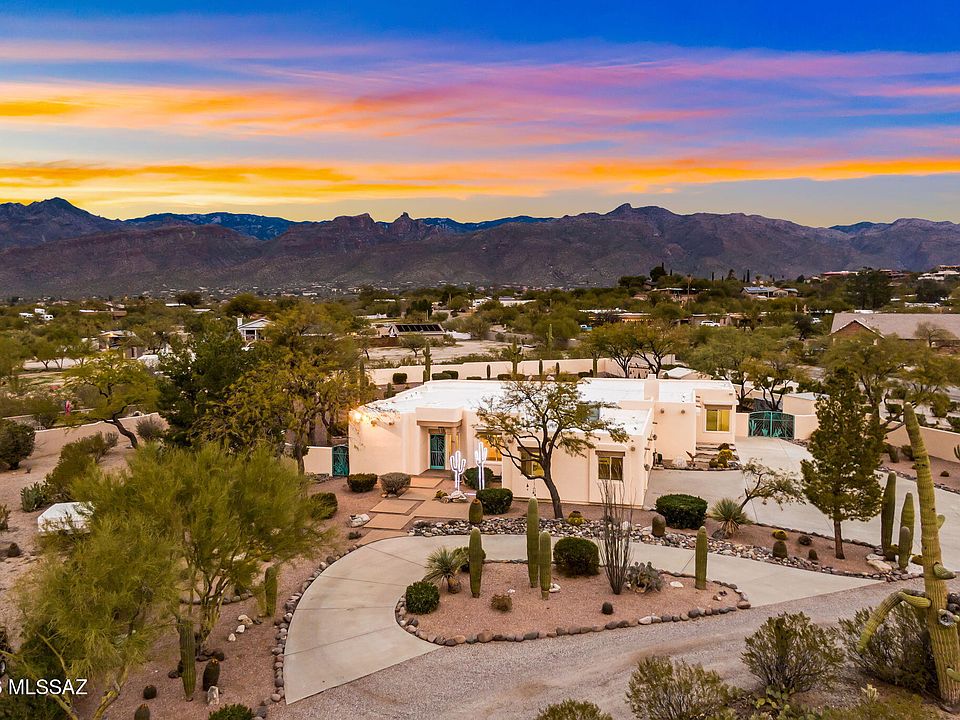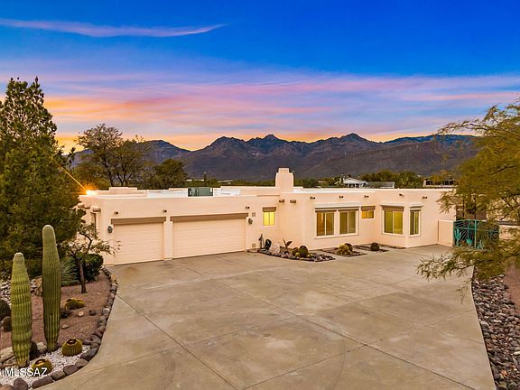 Discover refined desert living in this exceptional residence located in the highly sought-after Northeast Foothills of Tucson, where privacy, space, and breathtaking scenery come together on a sprawling almost one-acre lot tucked along a private lane. Surrounded by mature desert landscaping, including towering saguaros and striking golden barrel cacti, this property offers a rare sense of seclusion while keeping Tucson's most iconic destinations within easy reach. Inside, the home features nearly 3,000 square feet of thoughtfully designed living space with soaring ceilings, expansive windows, and stunning mountain views from nearly every room. Warm architectural details such as viga beams, a gas fireplace, and a custom built-in entertainment center create an inviting yet sophisticated atmosphere. The spacious layout flows effortlessly, making the home ideal for both everyday living and entertaining. The kitchen is equipped with granite countertops and generous workspace, while the spa-inspired primary suite offers direct access to the backyard and showcases mountain views, a jetted tub, walk-in shower, and dual vanities. Pride of ownership is evident throughout, making this home truly turn-key and ready for its next chapter. Step outside to a fully walled and beautifully landscaped backyard retreat with unobstructed views of Thimble Peak and the Catalina Mountains. An enclosed Arizona Room with heating and cooling, open patio spaces, and serene desert surroundings create the perfect setting for year-round enjoyment. Additional highlights include a three-car garage with custom built-in cabinetry, two color-matched storage sheds, and expansive concrete driveways with ample room for recreational vehicles, boats, and additional parking. Ideally positioned near Mount Lemmon, Sabino Canyon, Agua Caliente Park, Reddington Pass, and Saguaro National Park East, this home offers unparalleled access to hiking, biking, golf and all the outdoor lifestyles that defines Tucson living. All this, with popular shopping, dinning and entertainment only a couple minutes away, while also maintaining privacy and tranquility!