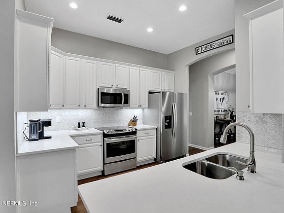 Discover unparalleled value in this charming home nestled within the coveted Magnolia Point Golf and Country Club. This is your chance to own the most affordable 4 bedroom home in this sought-after community without compromising on style or comfort. Step inside to find a world of modern elegance with brand new quartz countertops gracing the kitchen and stunning LVP flooring flowing seamlessly throughout the entire home. Enjoy peaceful mornings on your screened-in porch, overlooking the serene, live oak-filled corner lot. The split bedroom floorplan offers privacy and convenience, while a dedicated office space provides a perfect work-from-home sanctuary. The spacious dining room is ideal for entertaining guests or the large eat-in kitchen space offers a more informal family dining experience. Don't miss this golden opportunity to live the golf course lifestyle