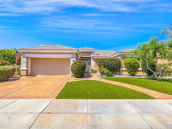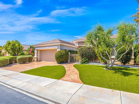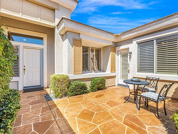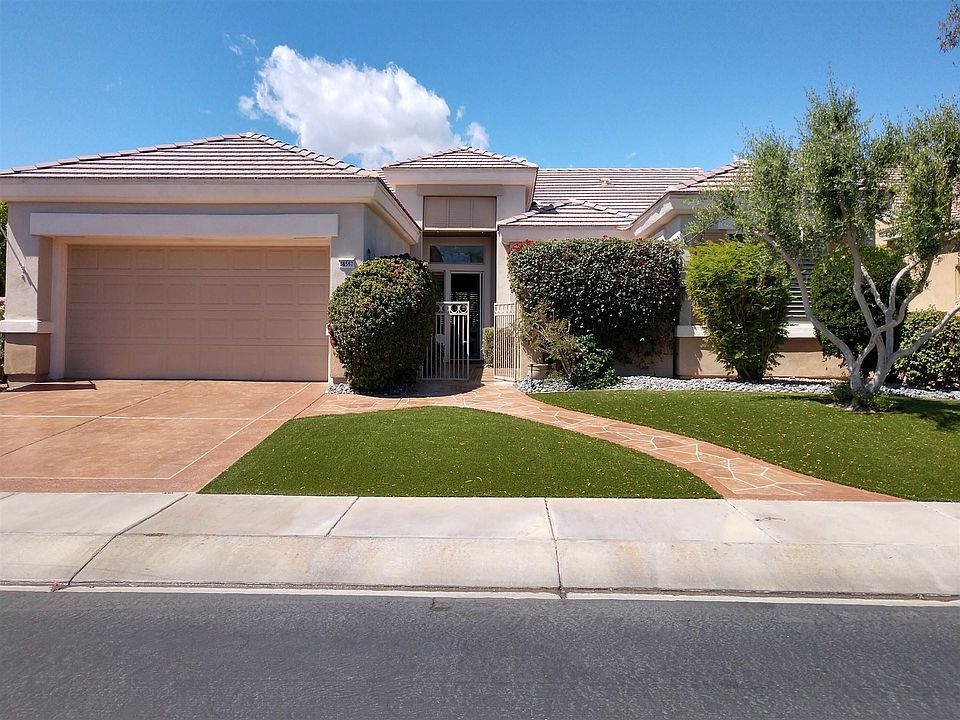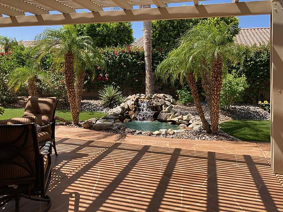 Sneak peek before professional photos. Located in the best 55+ community in The valley, Sun City Palm Desert. This Montego model with a casita is a rare and special find. The curb appeal is a great first impression with overlaid concrete, turf and mature easy-care landscaping. The casita has a bedroom, a full bath and closet, built-in dresser w/ wine fridge, and it's own entrance from the courtyard, giving your guests or caregiver a feeling of privacy and luxury. As you enter this beautiful home, your eyes are instantly drawn to the fabulous southwest facing backyard with a gorgeous rock waterfall, Alumawood patio cover, tropical landscaping, easy-care turf, Built in BBQ, fruit trees, and extended patio with concrete overlay front and back. There are Plantation shutters throughout, and 2 newer A/C's. The kitchen has been upgraded with quartz countertops, custom painted cabinets and hardware, and stainless appliances, The master is extended with a door out the the yard with a view of the soothing waterfall. The master bath has a double vanity, walk-in shower, and a large walk-in closet. The guest bedroom, bathroom, and the office/den are on the opposite side of the home for comfort and privacy. The office/den has a built in desk and office cabinet, perfect for completing your daily business. The laundry has upper cabinets and includes the W&D. The garage has lots of storage cabinets, and an epoxy floor coating. Turnkey furnishings are available outside of escrow.