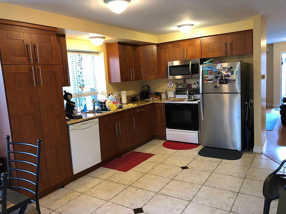 Spacious- 1-Level Condo, Corner Unit with Detached Garage and large outdoor patio/back yard. New Kitchen, wood and tile floors in living room and kitchen/dining room. Carpets in the bedrooms