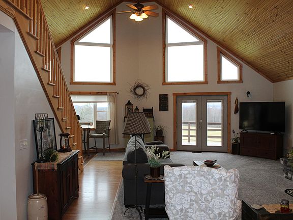 Rustic contemporary bursts with artistry and elegance. Vaulted ceiling, huge windows, scenic, serene views of mountains and wildlife.You can see the windmills! Hickory kitchen boasts of new appliances and recessed lighting and spacious enough for a table even though it has separate dining that has cozy pellet stove.Open floorplan allows a fireplace view from almost anywhere. Generac gen.and more!