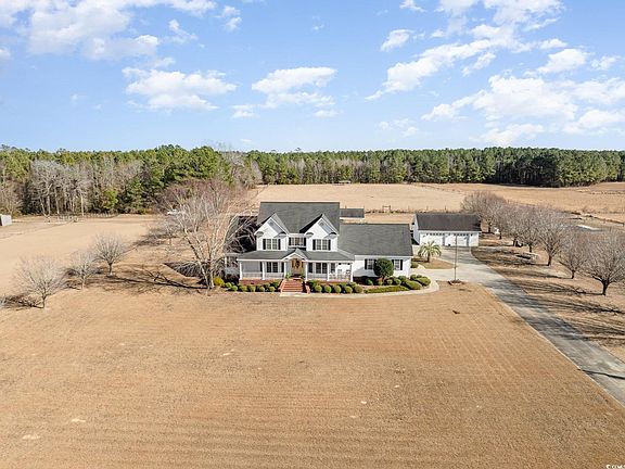 Nestled within 18.32 acres of pristine countryside near Myrtle Beach, South Carolina, this exceptional estate offers a harmonious blend of luxury, comfort, and functionality. Designed to cater to both intimate family living and grand-scale entertaining, the property boasts a plethora of features that distinguish it as a premier residence in the region. The primary home exudes timeless elegance, featuring an expansive open floor plan that seamlessly integrates living, dining, and kitchen areas. Soaring ceilings and abundant natural light enhance the sense of space and tranquility. The kitchen is equipped with stainless steel appliances, custom cabinetry complete with LED lighting, and granite counters. The primary suite serves as a private sanctuary, complete with a spa-like ensuite bathroom and a spacious walk-in closet. A 1322 sq ft charming guest house with 1 bedroom and 1 bathroom provides additional accommodations, ensuring privacy and comfort for visitors. This self-contained unit includes a cozy living area, a fully equipped kitchen, and well-appointed bedroom, making it perfect for extended family stays or hosting guests. The guest house is thoughtfully designed to offer all the comforts of home while maintaining a sense of seclusion from the main residence and it's own carport for additional vehicles. Bring your horses or your toys and enjoy this amazing property. The main home is equipped with with a security system and cameras to ensure peace of mind. The main home has a large inground pool with a fence and fire pit perfect for entertaining. No HOA! This home is protected by a 2-10 Home Buyers Warranty that is available for purchase at closing. If not purchased, the warranty expires on the date of closing.