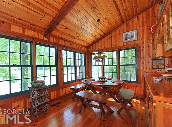 Serendipity on Lake Burton Nestled in a cove with views of the main body and Billy Goat Island, this charming 3BD/3ba cedar shingled cottage offers sunrise views and a large protected swimming area. A cozy great room addition was added in 1998 featuring warm heart pine, a masonry stone fireplace and wrap around windows that fill the space with natural light. Quality craftsmanship is evident in the vaulted ceiling with large exposed beams and beveled edge trim work. Enjoy a shaded grassy lakeside yard, full sun swim dock and 2-stall boathouse.
